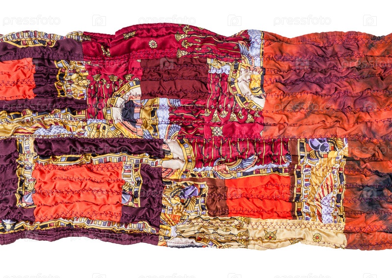 Фрагмент сшитого красного лоскутного шарфа изолирован
