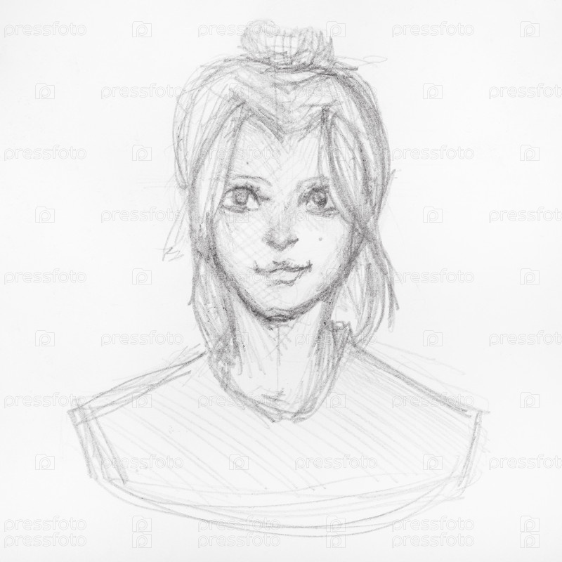 Эскиз головы счастливой девушки с прической в виде пучка