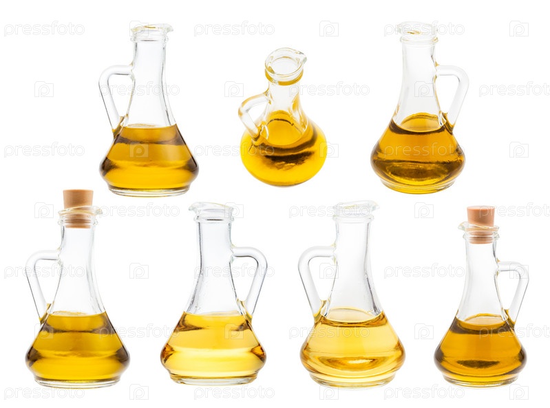Набор стеклянных кувшинов с маслами, изолированными на белом