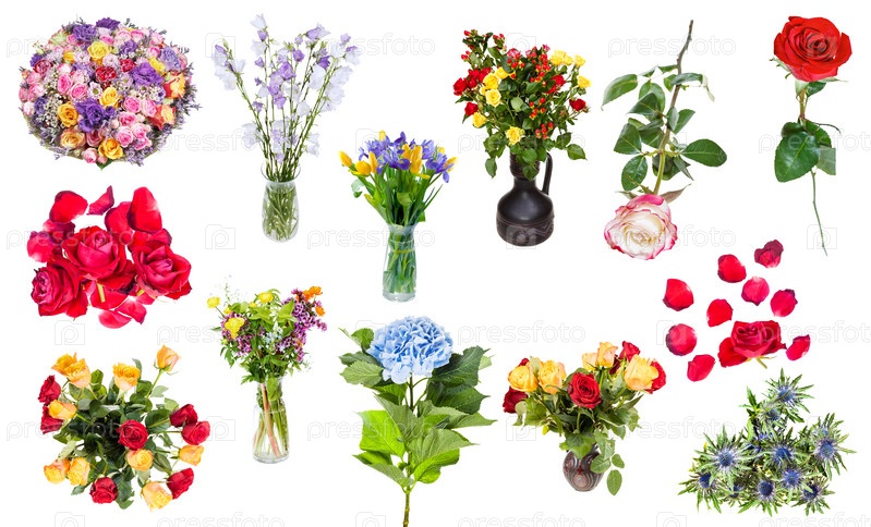 Набор цветов в вазах и одиноких изолированных