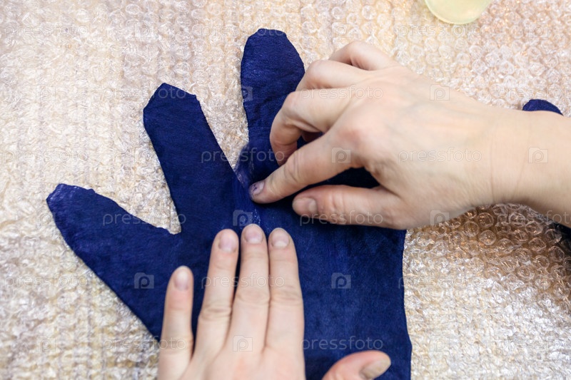 Мастер добавляет волокна на пальцы мокрой перчатки