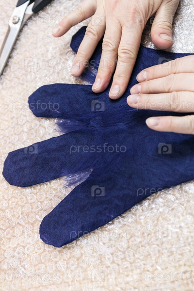 Мастер кладет волокна на пальцы мокрой перчатки
