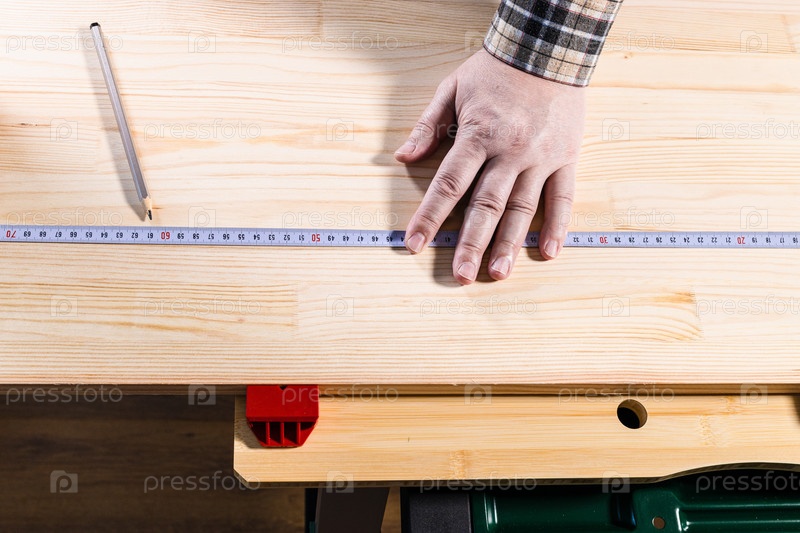 Вид сверху измерительной ленты на новой деревянной доске