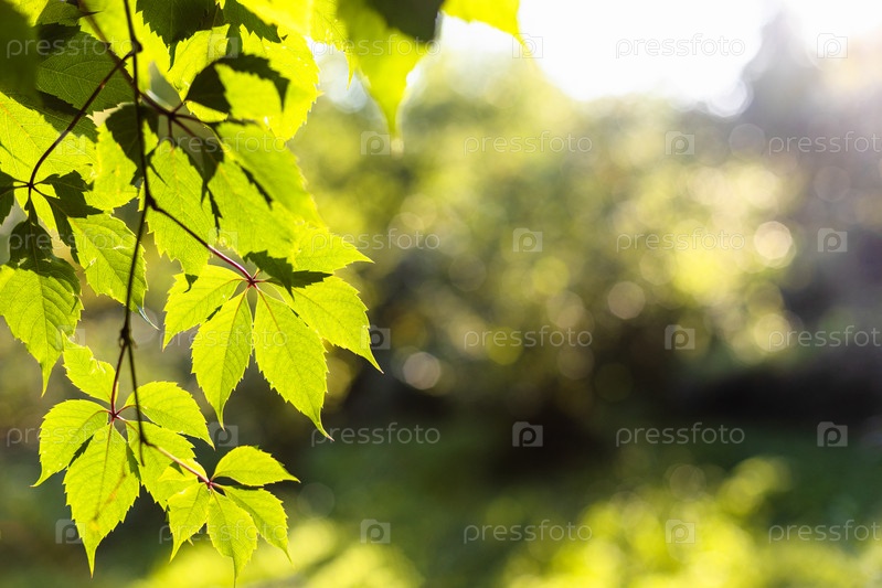 Зеленые листья, освещенные закатным солнцем и размытыми деревьями