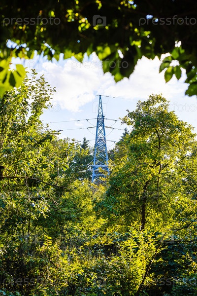 Высоковольтная линия электропередач между листвой деревьев