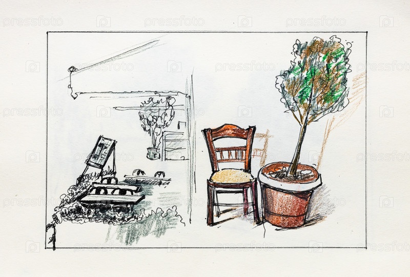 Нарисованный вручную деревянный стул рядом с деревом в горшке