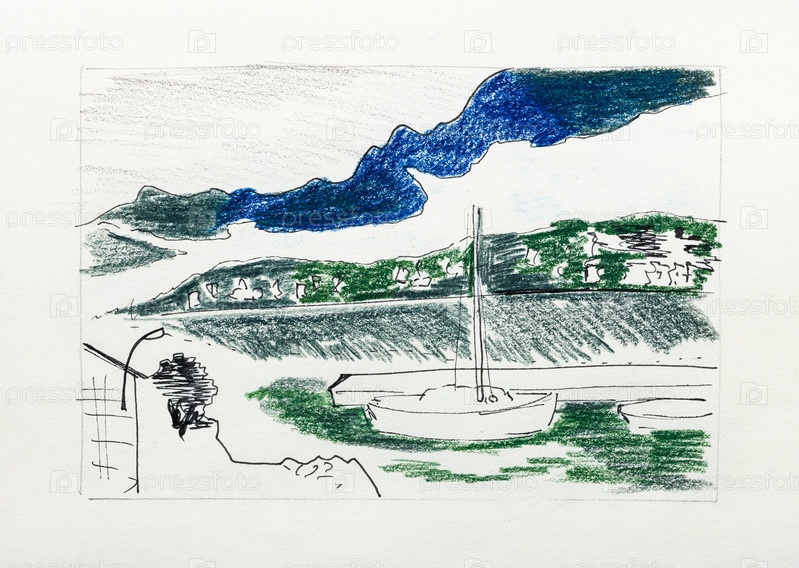 Нарисованная от руки маленькая яхта у причала цветными карандашами