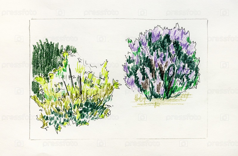 Цветущие кусты нарисованные от руки цветными карандашами