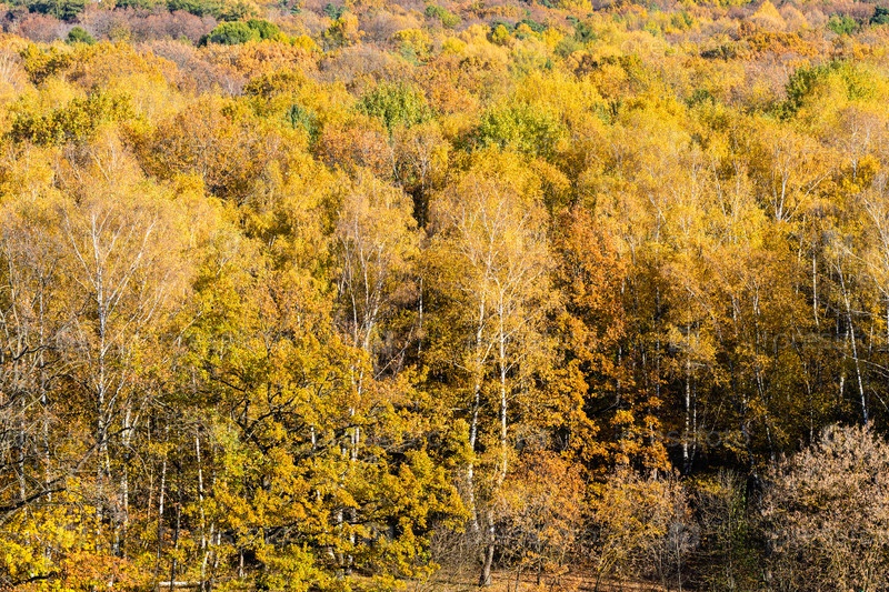 Над видом на березовую рощу в желтом осеннем лесу