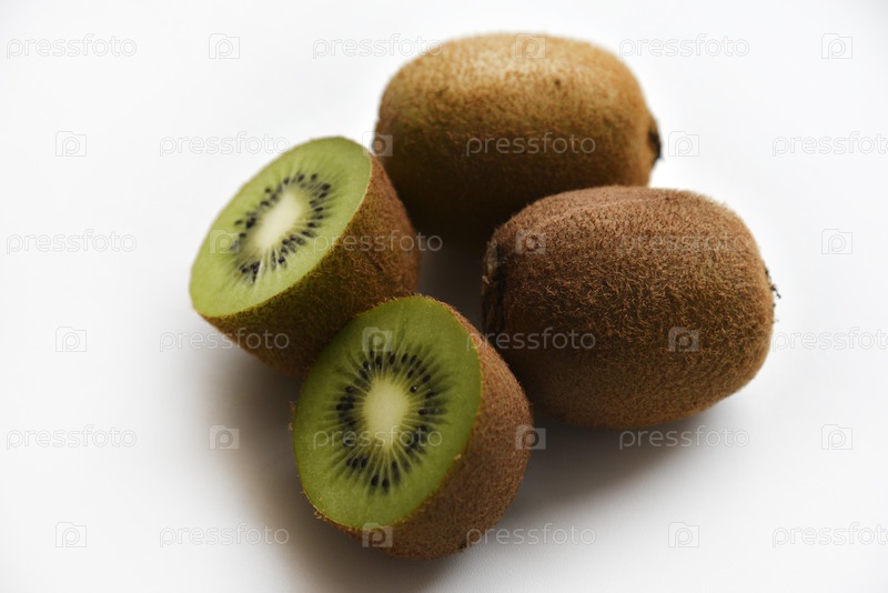 Нарезанные плоды зеленого сочного киви на белом фоне. Вкусные ломтики киви крупным планом