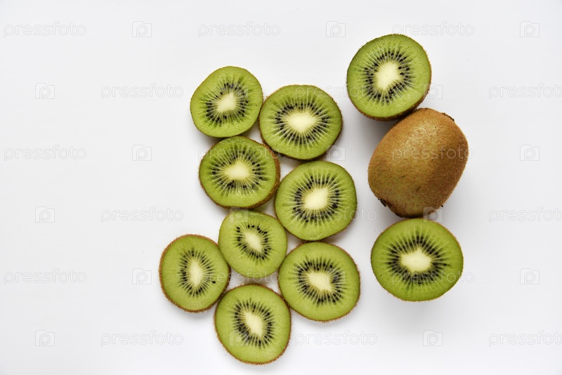 Нарезанные плоды зеленого сочного киви на белом фоне. Вкусные ломтики киви крупным планом