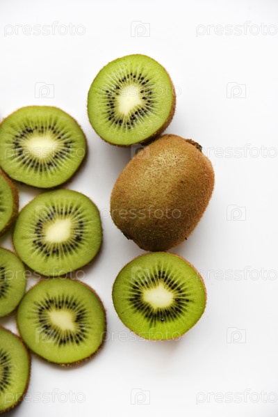 Нарезанные плоды зеленого сочного киви на белом фоне. Вкусные ломтики киви крупным планом