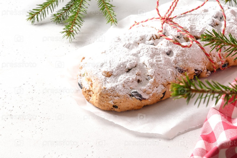 Рождественский штоллен с сухофруктами, орех на белом столе. Закрыть. Вкусные немецкие угощения