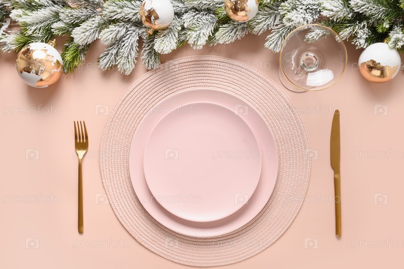 Рождественская розовая сервировка стола с золотым современным украшением и столовым серебром. Праздничный ужин. Вид сверху