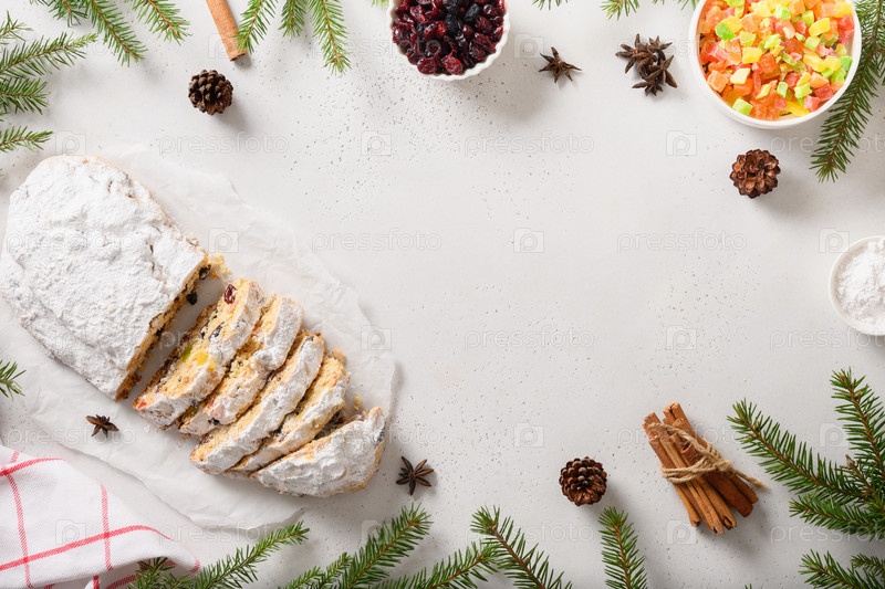 Рождественский штоллен со специями, изюмом и цукатами на белом фоне. Вид сверху. Скопируйте пространство. Вкусный традиционный немецкий хлеб