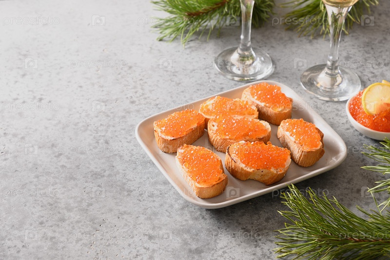 Закуска канапе из чиабатты с красной икрой на сером каменном столе. Рождественские, новогодние праздники. Праздничная еда. Закрыть