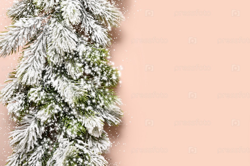 Рождественские золотые и белые роскошные безделушки и снежные ветки на розовом фоне