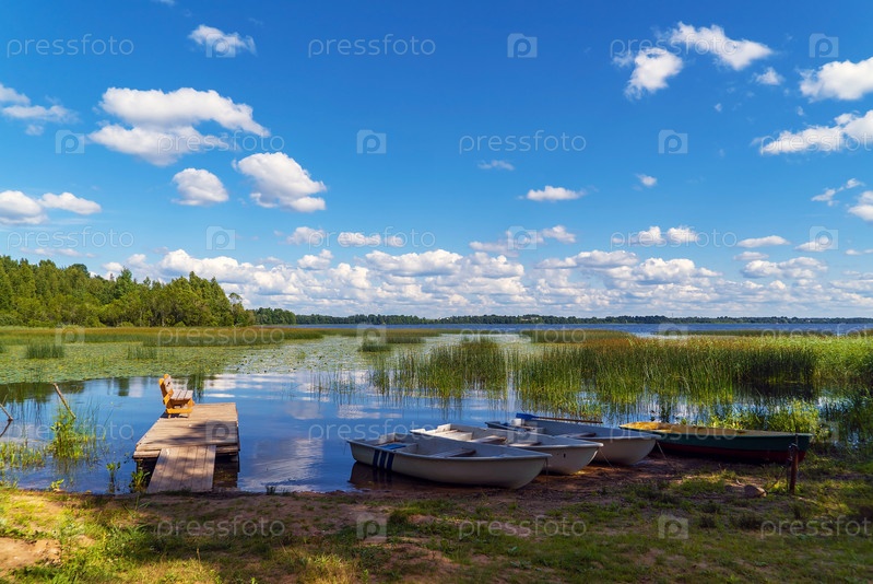 Деревянный пирс с лодками на озере Врево. Александровка. Ленинградская область