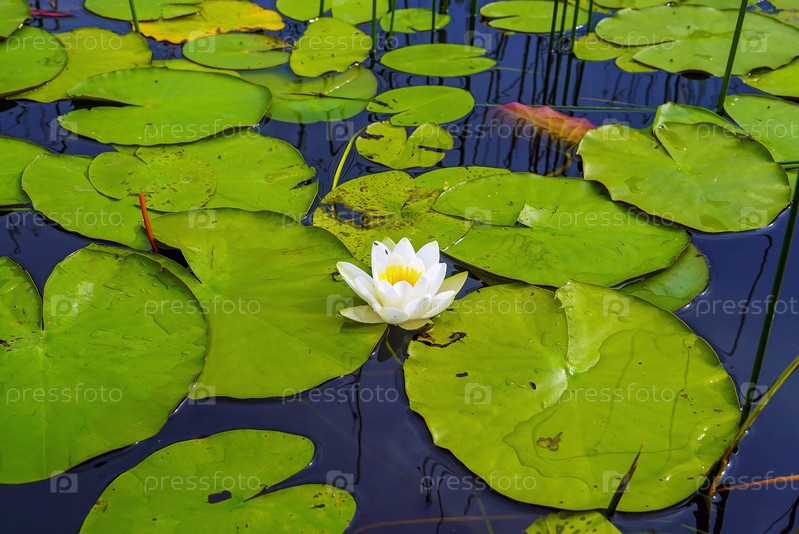 Цветок белой лилии в воде с зелеными листьями на озере