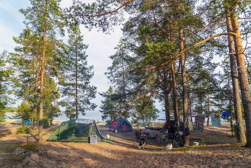 Палатки на песчаном пляже среди сосен. Ладожское озеро. Карелия