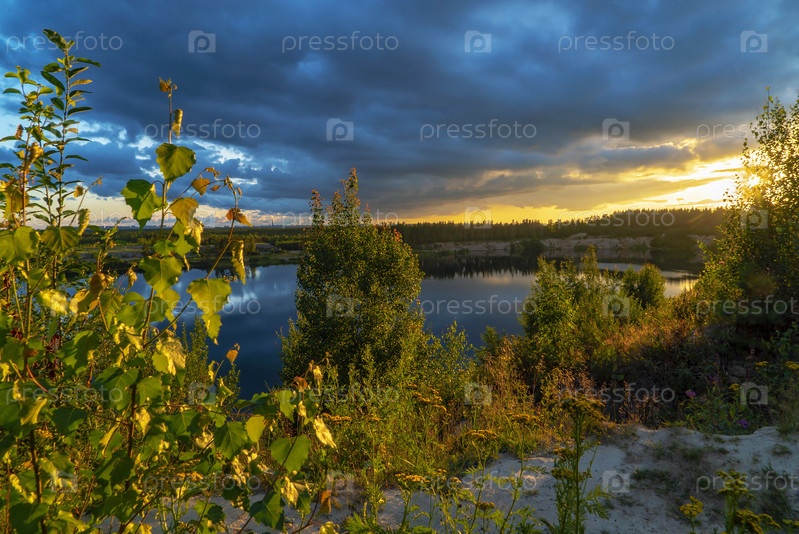 Дождевые тучи висят над водохранилищем на закате. Всеволожск, Ленинградская область