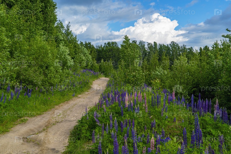 Фиолетовые и фиолетовые цветы люпина вдоль тропы в лесу