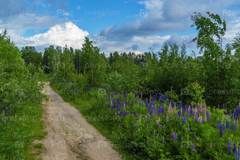Фиолетовые и фиолетовые цветы люпина вдоль тропы в лесу