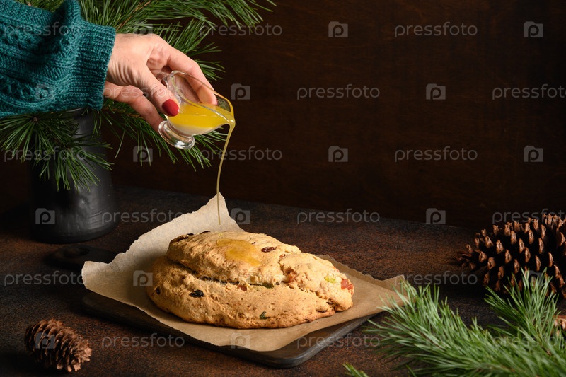 Женщина наливает масло на рождественскую елку на темно-коричневом фоне. Вертикальный формат. Закрыть. Приготовьте традиционный немецкий хлеб