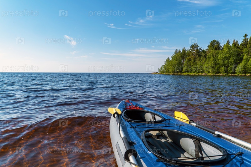 Синий каяк на берегу Ладожского озера. Карелия