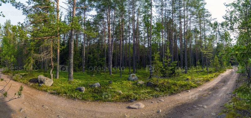 Дорога среди сосен в лесу. Ладожское озеро. Карелия
