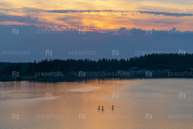 Серферы на стоячих гребных досках на фоне заходящего солнца. Ленинградская область