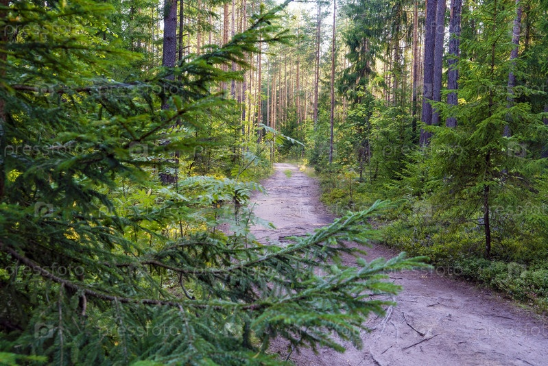 Лесная дорога среди елей и сосен. Всеволожск, Ленинградская область