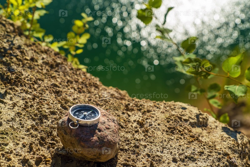 Магнитный компас лежит на камне на краю водохранилища