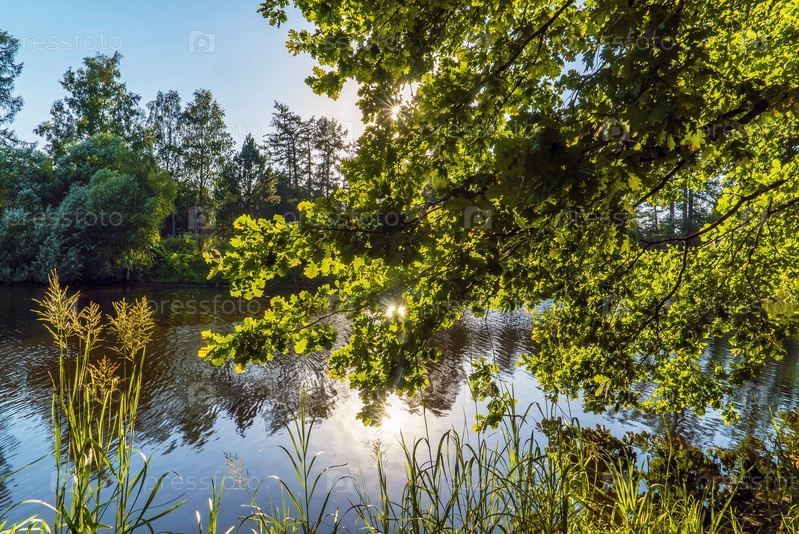 Зеленые ветви дуба опустились к воде. Всеволожск, Ленинградская область