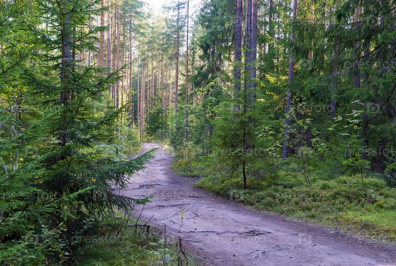 Лесная дорога среди елей и сосен. Всеволожск, Ленинградская область