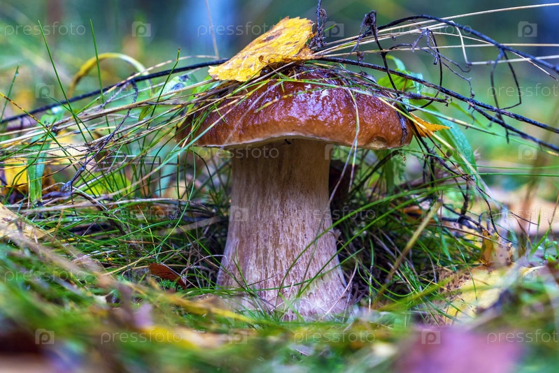 Молодой белый гриб в траве на лесной поляне