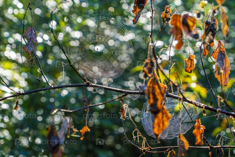 Две паутины рано утром в ярком свете