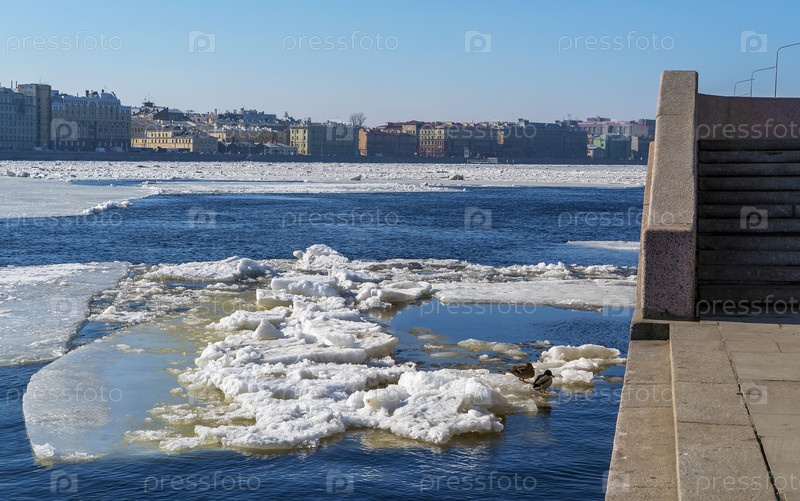 Весенний ледоход на Неве. Утки на льду