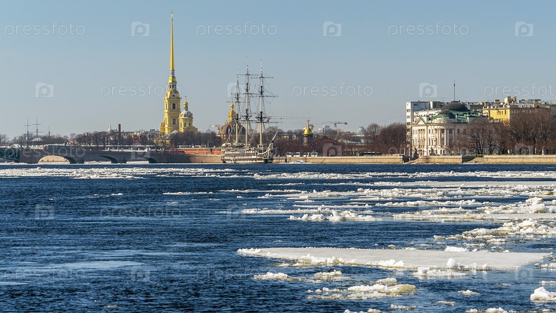 Весенний ледоход на Неве. Петропавловская крепость, фрегат «Грейс»
