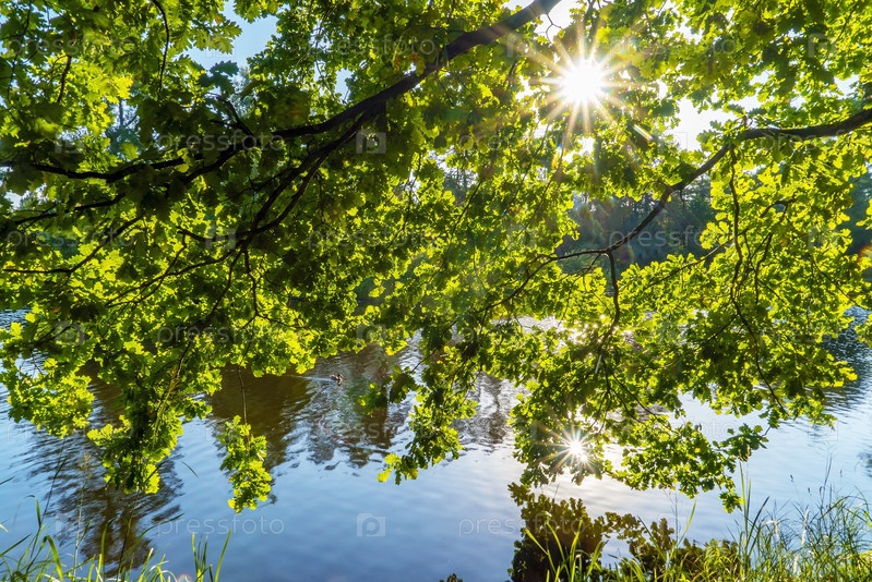 Зеленые ветви дуба опустились к воде. Всеволожск, Ленинградская область