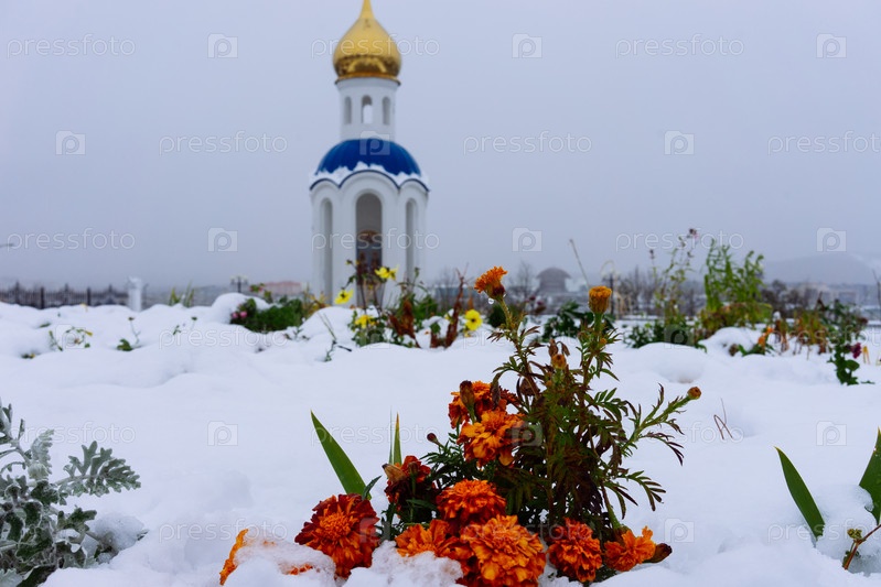 Естественный естественный фон с оранжевыми ноготками в снегу