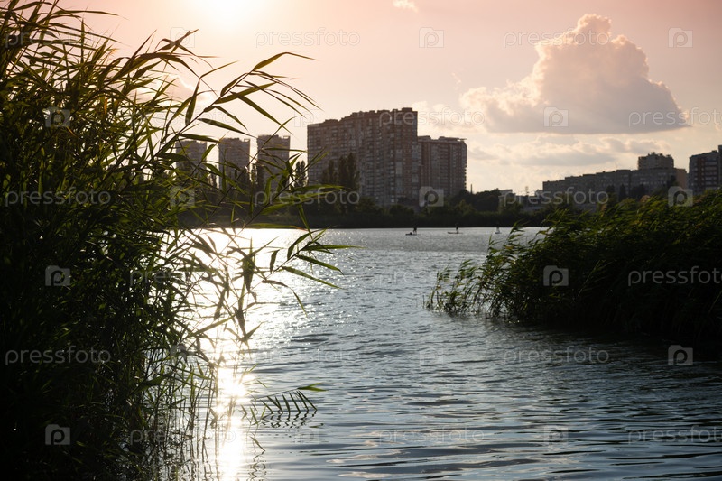 Пейзаж с камышами на фоне водной глади