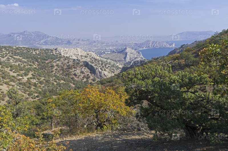 Осень в Крымских горах. Вид со склона горы Сокол (Куш-Кая) в сторону курортного города Судак. Солнечный день в октябре