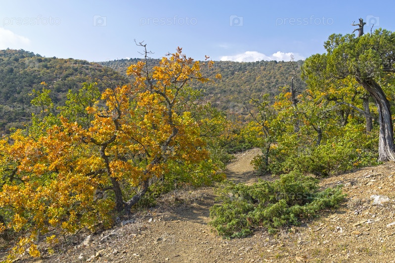 Красивый дуб с пожелтевшими листьями в крымских горах. Тропа в лесу рядом с курортным поселком Новый Свет. Солнечный день в октябре