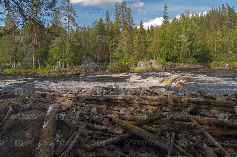 Остатки бон для молевого сплава леса на пороге Тахко-Падун на реке Чирко-Кемь. Карелия, Россия. Август, низкий уровень воды