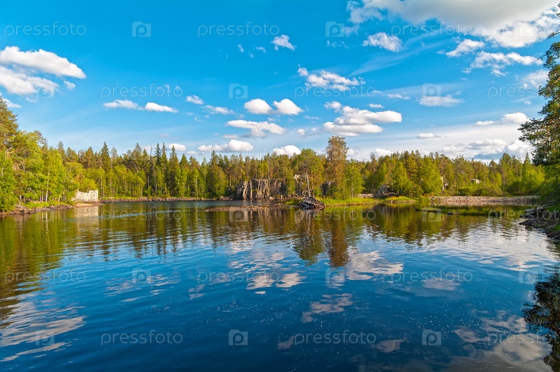 Отражение облаков в воде. Река Чирко-Кемь, Карелия, Россия. Солнечный день в августе