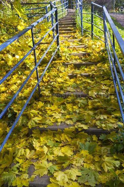 Лестница в парке, засыпанная опавшими кленовыми листьями. Солнечный день в октябре