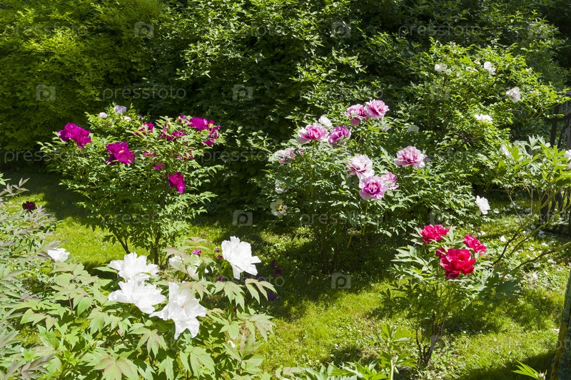 Цветущие разноцветные древовидные пионы. Солнечный день в конце мая. Аптекарский Огород (филиал ботанического сада МГУ), Москва
