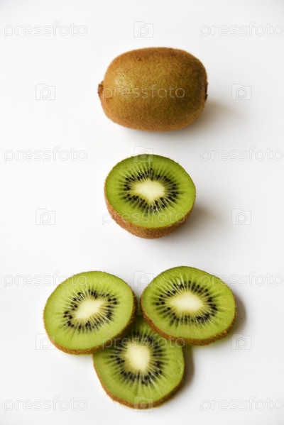 Нарезанные плоды зеленого сочного киви на белом фоне. Вкусные ломтики киви крупным планом
