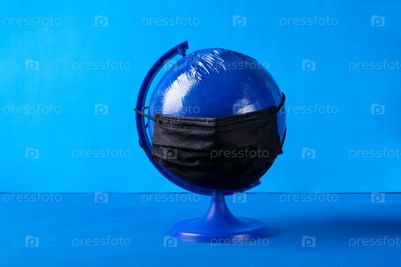 Макет глобуса с черной медицинской маской на синем фоне. Концепция пандемии и систем здравоохранения. Постковидные путешествия и санитарные ограничения